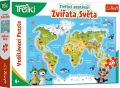Vzdělávací puzzle s mapou světa, zvířátky a Treflíky. Puzzle obsahuje 48 dílků, dílek cca 7 cm. Velikost složeného puzzle 60 x 40 cm.