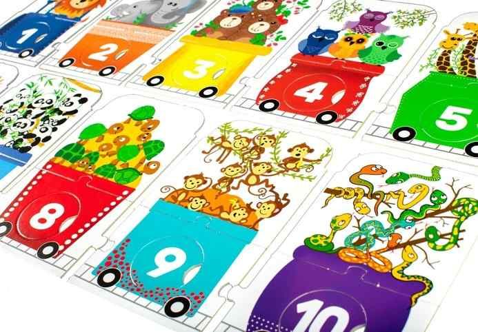 Balení puzzle 30 dílků osahuje obrázky jedné lokomotivy a 9 vagonků se zvířátky a čísly. Hra propojuje krativní dětskou hru a učení se novým znalostem a dovednostem. Děti se při hraní učí přiřazování správných částí puzzle, názvy zvířátek a číselnou stupnici, čímž rozvíjejí mentální schopnosti, a kognitivní a motorické dovednosti přiměřené batolecímu a předškolnímu věku. Velikost obrázku 135×23 cm.