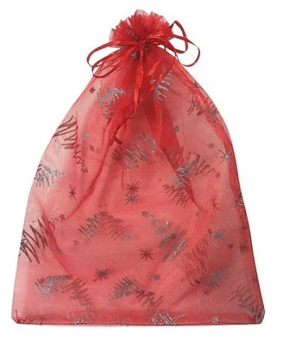 Pytlík organzový červený se stromky a s glitry 15 x 22 cm