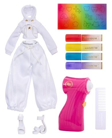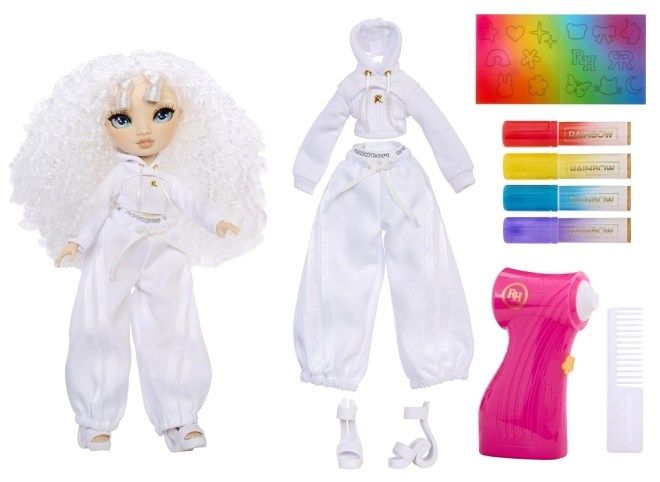 Cílem Rainbow High je podporovat kreativitu a sebevědomí prostřednictvím barev. Představujeme nový způsob, jak barevně stylovat panenku, kterou můžeš upravit podle své fantazie. Panenka je celá bílá, od hlavy až k patě, což ti umožní snadno vytvářet barevné variace a měnit její outfit nebo účes znovu a znovu. Můžeš použít omyvatelné fixy z balení v Airbrush pistoli nebo kreslit přímo na oblečení a vlasy. Poté stačí opláchnout a opakovat. Znovu a znovu. Obsah balení: • 1 panenka s pohyblivými klouby v kompletním outfitu • 1 airbrush pistole • 4 fixy • 1 hřeben • 1 šablona na různé vzory Na baterie: 4x AAA (nejsou součástí balení)