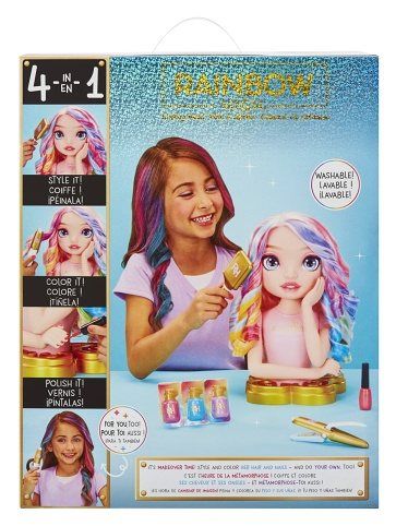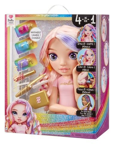 Úplně nová česací hlava ve stylu nejoblíbenější Rainbow High panenky Belly. Můžeš vytvářet melíry, barvit vlasy nebo lakovat nehty. Obsah balení: • 1 česací hlava • 1 kartáč na vlasy • 3 barevné krémy • 1 nástroj na barvení vlasů • 1 lak na nehty Výška česací hlavy cca: 33 cm.