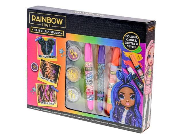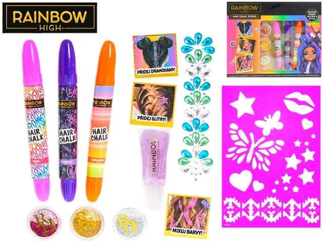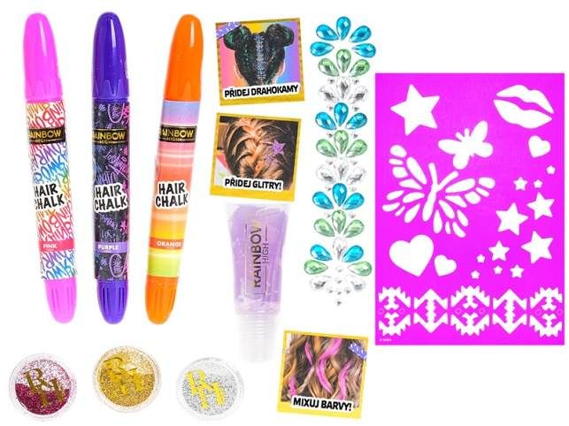 Rainbow High je střední škola, na níž se všichni studenti oblékají jako módní ikony a z jejich stylu jde každému hlava kolem! Rainbow High sada je ideální jako dárek k narozeninám nebo jiné zvláštní příležitosti pro všechny fanynky. Dekorativní sada obsahuje křídy na vlasy, kamínky, šablonky, gel a glitry.