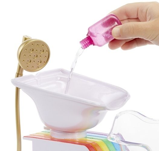 Udělej svojí panence i sobě senzační účes v Kadeřnickém salónu. Panence můžeš umýt vlasy ve funkčním kadeřnickém křesle a obarvit je barevnou pěnou, kterou sama vytvoříš. Na vlasy můžeš použít i třpytivý gel. Vlasové doplňky jsou určené pro panenku i pro tebe. Obsah balení: více než 20 překvapení kadeřnické křeslu s funkčním umyvadlem prášek pro přípravu 5 různě barevných pěn na vlasy třpytivý gel a kartáč k nanášení třpytek další doplňky (lžička, kartáč na vlasy…)