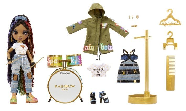 Rockstar panenky jsou připravené zazářit na pořádné párty. Každá panenka má svůj hudební nástroj a 2 outfity. Mají nádherné dlouhé česatelné vlásky, dlouhé řasy a také ohebné klouby na nohou a rukou. Obsah balení: • 1 krásná panenka s dlouhými česatelnými vlásky • 2 outfity • módní doplňky (boty, náhrdelník, náušnice… ) • hřeben na vlasy • ramínka na šaty • stojánek na panenku • 1 hudební nástroj