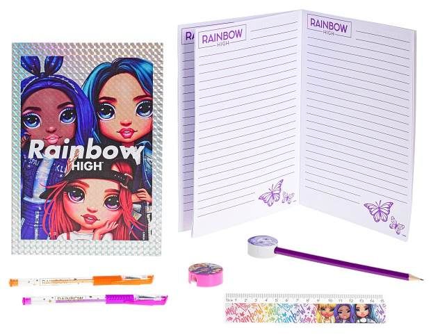 Rainbow High je střední škola, na níž se všichni studenti oblékají jako módní ikony a z jejich stylu jde každému hlava kolem! Rainbow High sada psacích potřeb se zápisníkem pro všechny fanynky! Sada obsahuje zápisník v pouzdru, gelové propisky, tužku, gumu, pravítko a ořezávátko. Vhodné pro děti od 3 let.