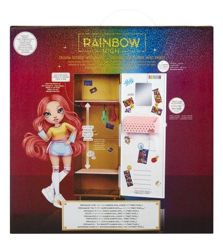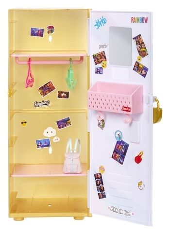 Prostorná a dostatečně vysoká školní skříňka, tak aby se do ní vešla jakákoli Rainbow High Fashion panenka. Sama si můžeš skříňku uspořádat pomocí 2 polic, tyče na zavěšení oblečení a košíku. Aby bylo vše v bezpečí, můžeš skříňku zamknout na visací zámek. V balení najdeš samolepky na ozdobení skříňky, školní batoh a spoustu dalších doplňků. Obsah balení: • 1 panenka s pohyblivými klouby • 1 skříňka • 1 visací zámek • 1 list se samolepkami na ozdobení skříňky, na kterém je více než 25 samolepek • 1 školní batoh • 1 hrnek na kávu • 1 deník • 1 tužka • 1 pár bot • 1 mikrofon • 2 ramínka