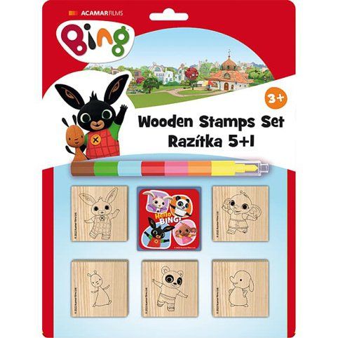 Set obsahuje 5 snadno uchopitelných dřevěných razítek, barevnou podušku s oblíbeným motivem a sedmibarevnou skládací voskovku pro vybarvování.