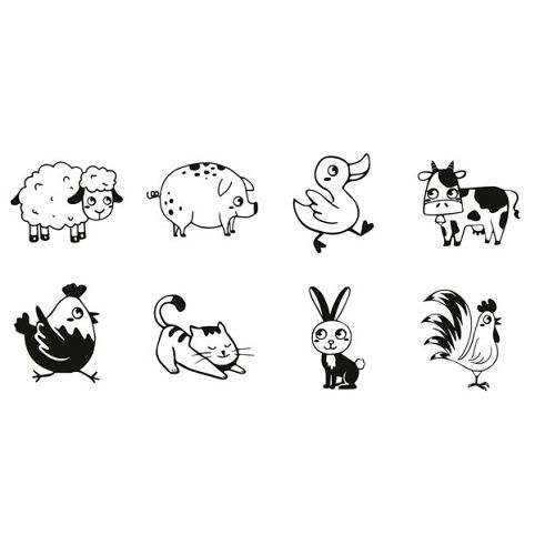 Sada 8 dětských razítek s motivy zvířat z farmy a razítkovací polštářek černé barvy. Kvalitní dřevěná razítka pro děti v nové EKO-FRIENDLY řadě, roztomilá a všestranně využitelná.