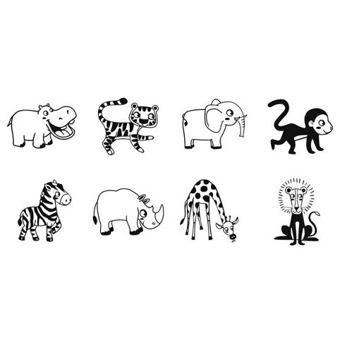 Sada 8 dětských razítek s motivy zvířátek ze safari a razítkovací polštářek černé barvy. Kvalitní dřevěná razítka pro děti v nové EKO-FRIENDLY řadě, roztomilá a všestranně využitelná.