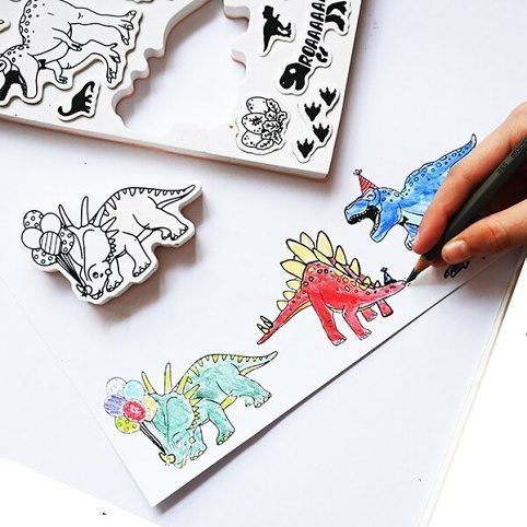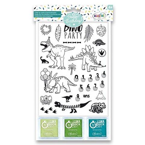 Kreativní razítka Aladine Stampo Birthday pro děti na blistru.Ideální na výrobu narozeninových pozvánek, narozeninovou výzdobu, na výtvarnou dílnu i hry na oslavě. Razítka mají široké využití v procvičování počítání, vybarvování, vystřihování. Sada Dinosouři obsahuje 30 nápaditých razítek. Rozměr blistru: 20 x 15 cm.