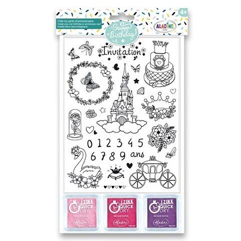 Kreativní razítka Aladine Stampo Birthday pro děti na blistru.Ideální na výrobu narozeninových pozvánek, narozeninovou výzdobu, na výtvarnou dílnu i hry na oslavě. Razítka mají široké využití v procvičování počítání, vybarvování, vystřihování. Sada Princezny obsahuje 35 nápaditých razítek. Rozměr blistru: 20 x 15 cm.