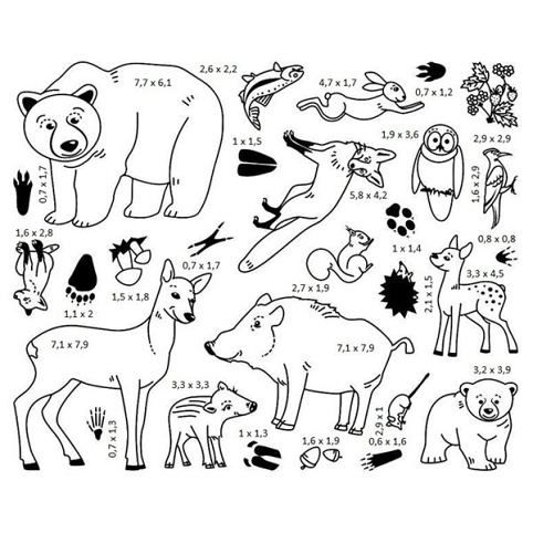Autorská sada české výtvarnice Ireny Slavíkové: gumová razítka na pěnové hmotě, včetně černého inkoustového polštářku. Inoust je vypratelý a umyvatelný. Sada obsahuje 28 různých tamponových razítek s obrázky zvířátek, jejich mláďátek, stopy a také s obrázky toho, čím se živí.