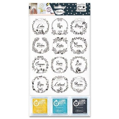Sada Měsíce z edice Razítka pro radost obsahuje 12 pěnových razítek včetně 3 barevných inkoustů. Názvy měsíců jsou v češtině.