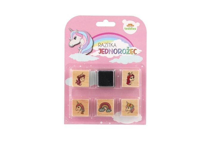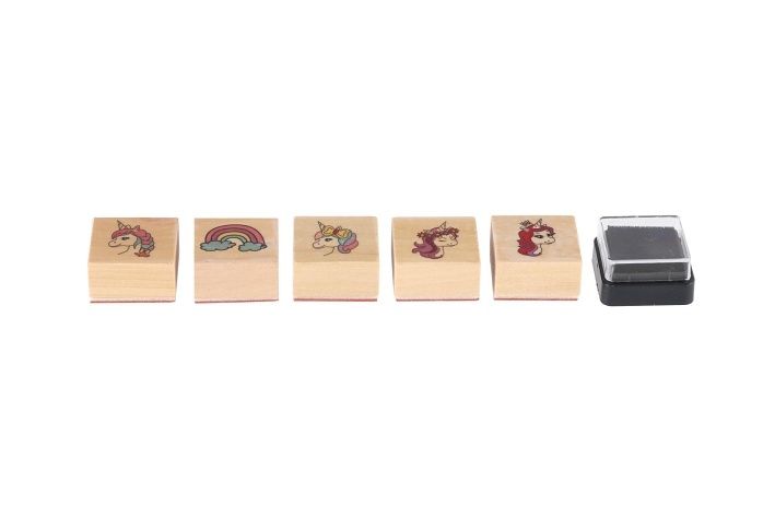 Razítka dřevěná 5+1 s poduškou jednorožci 3x3cm na kartě