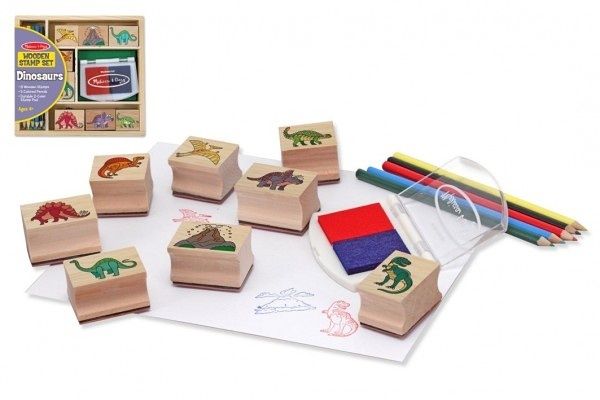 Děti si rády hrají s razítky s motivy dinosaurů. Mohou vytvářet obrázky a zároveň je i vybarvovat . Baleno v dřevěné krabičce pro pohodlné uchování razítek.