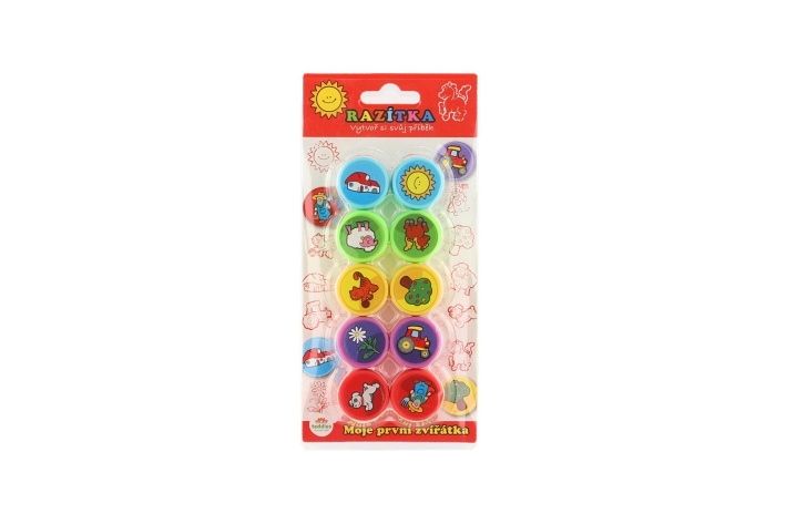 Dětská razítka potěší každé malé dítě. Děti mohou tisknout s razítky jednotlivé obrázky, dokreslit si je a poskládat z nich příběh. Balení obsahuje 10 ks razítek.