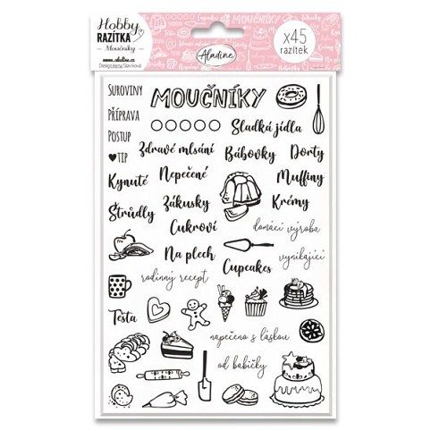 Sada Moučníky obsahu 45 nápaditých razítek určených ke kreativnímu označování dortíků, koláčů a dalších dobrot. Nápisy jsou v češtině.