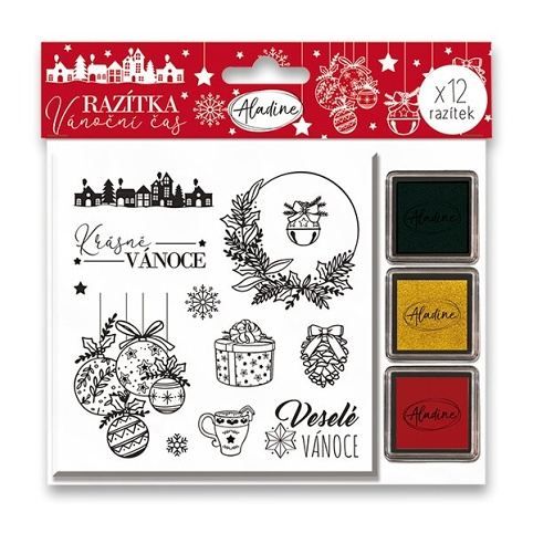 Sada vánočních razítek Razítka Stampo Nöel Aladine Vánoční čas z edice České Vánoce obsahuje 12 vánočních razítek včetně 3 barevných inkoustů. To celé je v praktickém balení. Sada obsahuje nápisy v češtině.