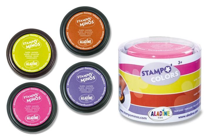 Sada razítkových podušek velikosti XL pro tamponová razítka Aladine Stampo Baby a Stampo Minos. Sada obsahuje 4 podušky - růžovou, fialovou, světle zelenou a hnědou.