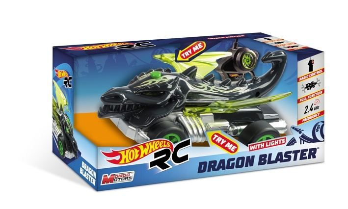 RC auto (1:24) Hot Wheels ve tvaru draka. Auto svítí a hýbe křídly. Určeno pro děti od 3 let. Auto vyžaduje 3× AA baterie (jsou součástí balení a dálkové ovládání 2× AA baterie (nejsou součástí balení). Na baterie: 3x AA (jsou součástí balení)