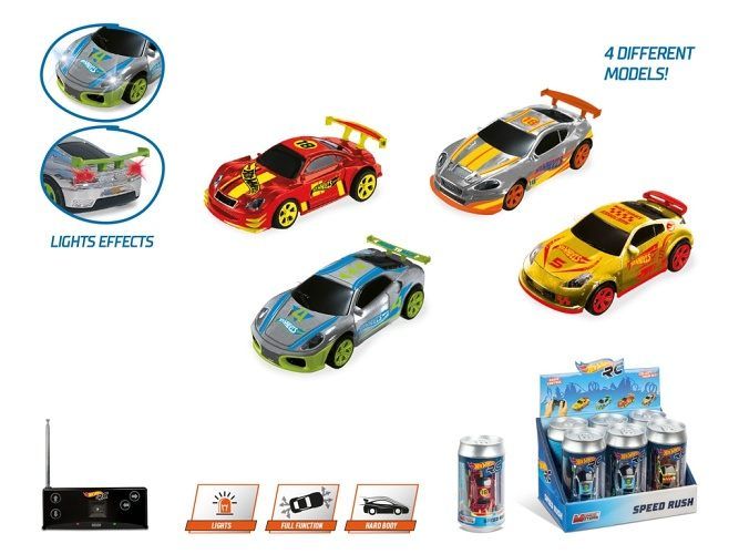 RC auto Hot Wheels se světelnými efekty v originálním balení plechovka. K dostání ve 4 různých designech. Určeno pro děti od 3 let. Auto vyžaduje 1,2 V nabíjecí baterii (je součástí balení) a dálkové ovládání vyžaduje 2× AA baterie (které nejsou součástí balení). Na baterie: 1x 1,2V (je součástí balení)