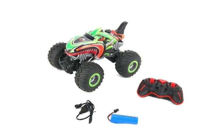 RC auto v designu žraloka. Pohyb doleva, doprava, dopředu a dozadu. Indikátor světla, přepínač, přepínač světla a zvuku. Maximální rychlost 10km/h. Frekvence 2,4GHz, frekvenční pásmo 2410–2473 MHz. Jediný radiofrekvenční výkon 1mW, dosah dálkového ovládání 40–50m. Efekt spreje – přidejte kapku vody. USB kabel součástí. Na baterie: 1x 3,7V (je součástí balení), 2x AA (nejsou součástí balení)
