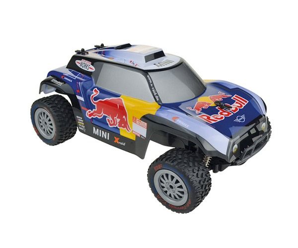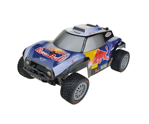 Dvoukanálový model auta na dálkové ovládání X-Raid MINI JCW Buggy Red Bull 1:16, frekvence 2,4 GHz. Může jezdit až 10 závodníků najednou. 30,5 x 11,5 x 17 cm.