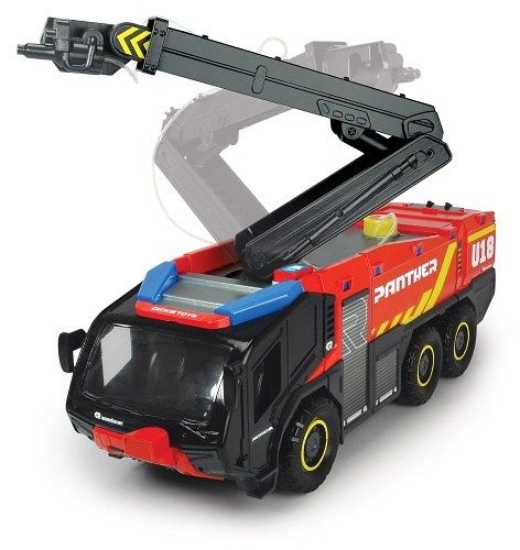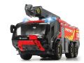 Letištní hasičské auto Rosenbauer Panther 6x6 na dálkové ovládání, 4 kanál, frekvence 2,4 GHz, se světelnými a zvukovými efekty, pohyblivé výsuvné rameno se stříkačkou, s funkcí stříkání, realistický interiér auta s úložným prostorem. Velikost 62 cm.