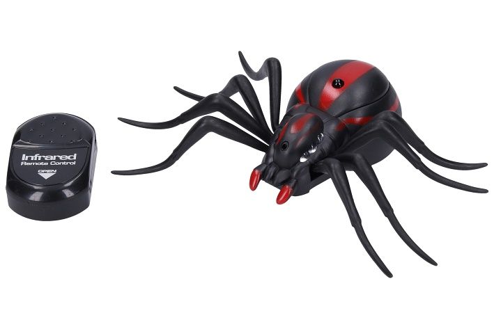 RC pavouk černá vdova. Velikost 15 cm. Pohyb dopředu a couvání do strany. 6xLR44 baterie součástí (3 ovladač, 3 pavouk). Krytka na baterie a ON/OFF přepínač na spodní straně. A,B,C frekvenční kanály. Obrázkový návod na obalu.