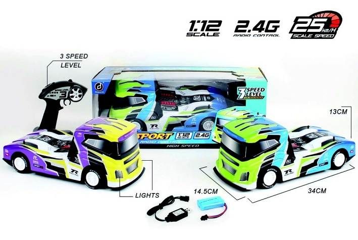 Moderní RC závodní tahač vybavený výkonným motorem s možností 3 rychlostních nastavení (do 8km/h, 16km/h a 25km/h). Funční přední světla, absorbční tlumiče na obou nápravách, realistický vzhled. Frekvence 2.4GHz. Dva barevné assorty. Dálkové ovládání vyžaduje 3×AA baterie (nejsou součástí balení) a RC tahač 7,4V 500mAh Li bateriovou sadu (je součástí balení). USB dobíjení. Pro děti od 5 let. Na baterie: 3x AA (nejsou součástí balení)