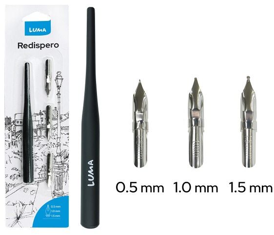 Redispero sada- pro práci s inkoustem či tuží- plastová násadka s povrchovou úpravou "soft touch"- délka násadky: 125mm- 3ks redispero hrot: 0.5mm, 1.0mm, 1.5mm- materiál hrotů: nerezová ocelUPOZORNĚNÍ:Není hračka. Slouží k výtvarným účelům. Doporučujeme dohled dospělé osoby. Nevkládat do úst, hrozí poranění o hrot.