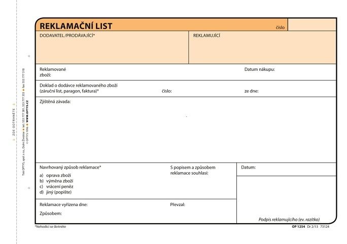 - PAPÍRNICTVÍ / TISKOPISY / RŮZNÉ / OSTATNÍ / Reklamační listy / A5 / OPTYS
