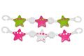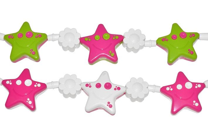 Řetěz na kočárek - hvězdy, kytičky. Figurky z tvrdého plastu navlečené na mírně pružicím lanku jsou barevné a jednoduše tvarované (stačí umýt v mýdlové vodě). Snadno se připevní na kočárek. Jsou vyrobeny ze zdravotně nezávadných materiálů podléhajícím přísným hygienickým normám.