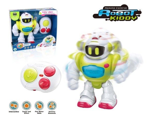 Interaktivní robot Kiddy na dálkové ovládání pomocí infrared. Robot se dokáže otáčet o 360°, chodí dopředu, dozadu i do stran. Součástí balení je ovladač. Robot má funkci nahrávání hlasu a různé změny hlasu. Dosah ovladače 8–10 m. Vhodné pro děti od 18ti měsíců. Na baterie: 3x AA (jsou součástí balení), 2x AA (nejsou součástí balení)