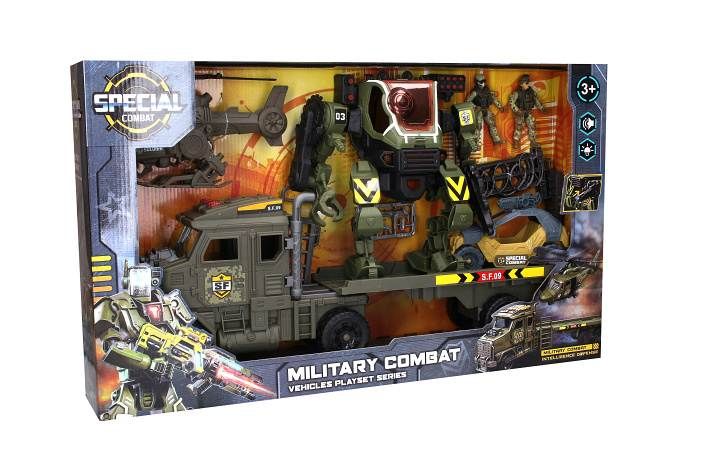 Robot mecha s efekty set s tahačem a helikoptérou. Obsah balení - vojenský tahač 60x11x21 cm (volná kola), robot s efekty 25x11x26 cm, helikoptéra 24x13 cm, bugina s kulometem 16 cm, 2x figurka pilot 11 cm, opevnění a vybavení pro vojáky. Robot vydává světelné a zvukové efekty. Aktivace tlačítkem ve středu robota. Opakovaným stiskem se přepínají různé zvukové efekty (pohyb robota, střelba, apod. ). Robot - 2xAG13 baterie součástí balení.