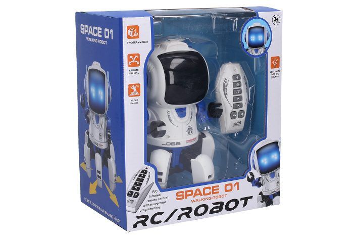 Robot se 6 nohama RC na dálkové ovládání. Rozměry 15x15x18 cm. Infračervený port. Světelné a zvukové efekty. Funkce - podsvětlený obličej (různé výrazy), programování, chůze, tanec, hudba. 3xAA baterie do robota, 2xAAA do ovladače nejsou součástí.
