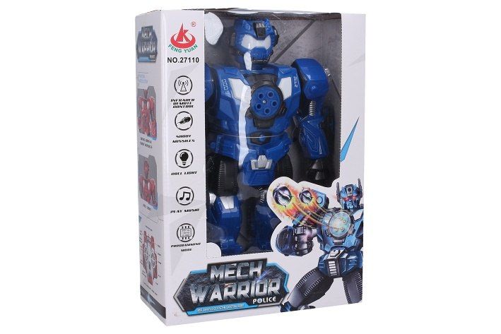 Robot střílející šipky RC na dálkové ovládání. Rozměry 24x10,5x33,5 cm. Infračervený port. Součástí 5 šipek. Světelné a zvukové efekty. Funkce - střílení šipek, programování, demo režim, chůze, klouzání, tanec, hudba. 4xAA baterie do robota, 2xAA do ovladače nejsou součástí. Tlačítko demo v pase robota. Přepínač ON/OFF na zadní straně robota.
