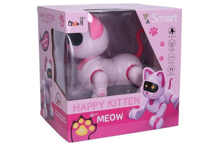Robotická kočka RC na dálkové ovládání. Rozměry 21x18x13 cm. Infračervený port. Bateriový pack 3. 7V 400mAh Li-ion do kočky, 2xAAA do ovladače nejsou součástí. USB kabel součástí. Přepínač ON/OFF v zadní části hlavy. Reaguje na dotyk hlavy. Ovladač - pohyb, demo, programování (až 30 kroků), nastavení hlasitosti.