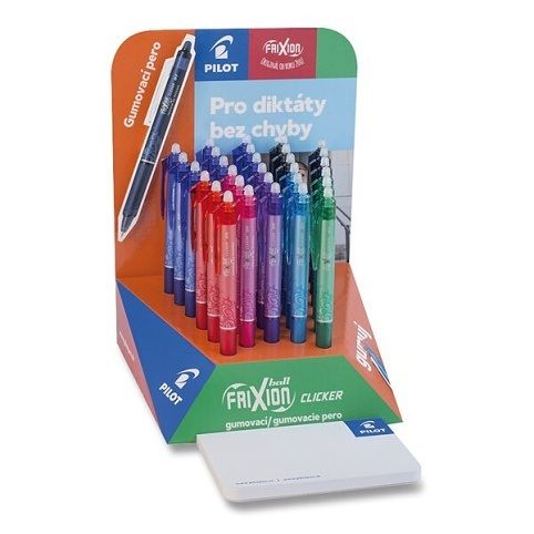 Přepisovatelný roller s tekutou náplní a stiskacím mechanismem. Šíře stopy 0,25 mm, šíře hrotu 0,5 mm.Stojánek, 30 kusů.