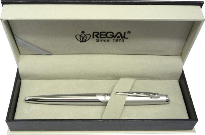 Roller s vyměnitelnou náplní uložený v dárkové krabičce, stříbrné kovové tělo a barevné vičko se stříbrným klipem, náplň modrá + dárková taška Regal