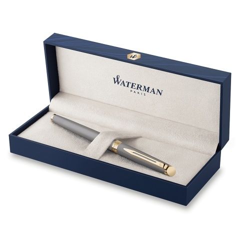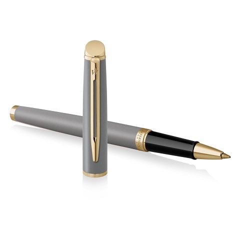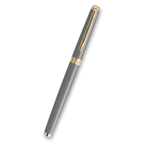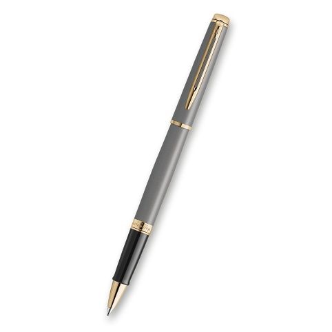 Roller Waterman Hémisphére The Understated Edit Stone Grey GT s tělem a víčkem z nerezové oceli povrchově upravené metalickým lakem v barvě stone grey. V kombinaci s doplňky potaženými světlým zlatem a úchopovou částí z černé pryskyřice.