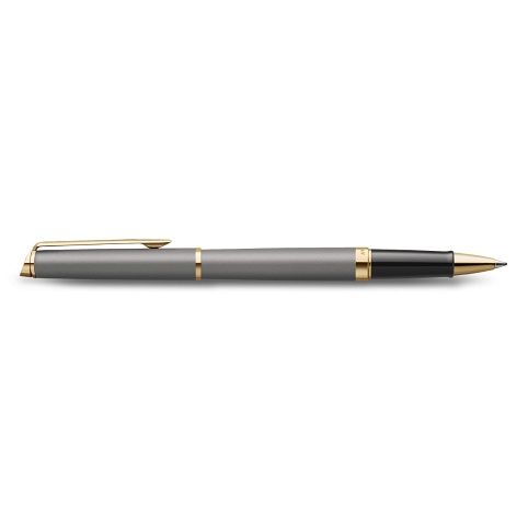 Roller Waterman Hémisphére The Understated Edit Stone Grey GT s tělem a víčkem z nerezové oceli povrchově upravené metalickým lakem v barvě stone grey. V kombinaci s doplňky potaženými světlým zlatem a úchopovou částí z černé pryskyřice.