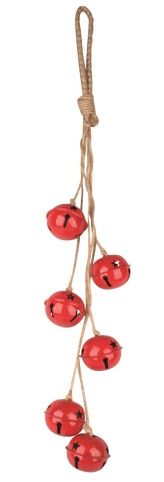 Rolničky na provazu červené Přivolejte si domů Ježíška za zvuku rolniček! Velké rolničky na provaze budou velmi hezky vypadat třeba na vchodových dveřích či vratech. Celková délka provazu s rolničkami je 51 cm.