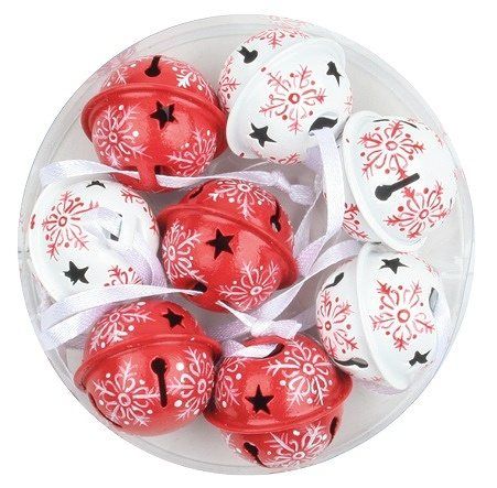 Rolničky na zavěšení červenobílé s vločkou 3 cm, 8 ks