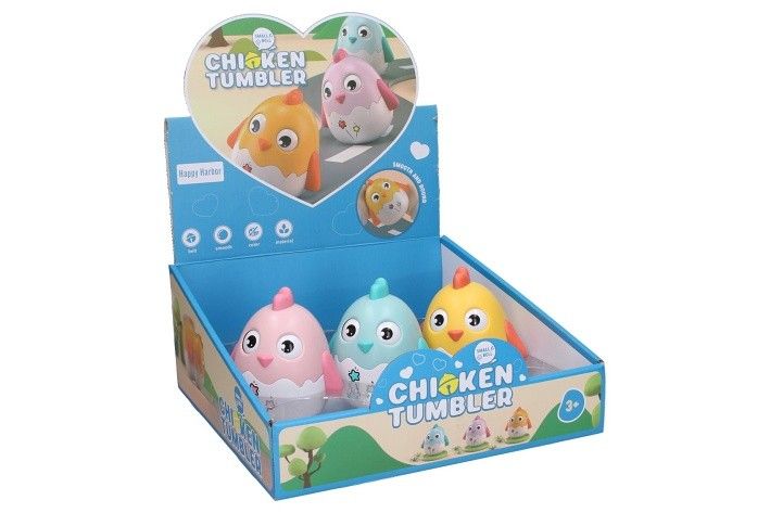 Roly poly kuře s rolničkami. Velikost 12x9x12 cm. Display box 9 ks. 3 varianty - žlutá, růžová, modrá.