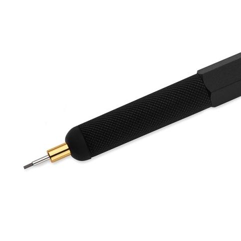 Celokovové šestiboké tělo sprotiskluzovou rýhovanou úchopovou částí a se zlatými prvky. Matně černě lakované mosazné tělo vkombinaci s doplňky vdané barvě., Zatáhněte tuhu a používejte stylus bez nutnosti otáčení mikrotužky. Měkká špička stylusu hladce klouže po povrchu a je kompatibilní se všemi dotykovými obrazovkami. Vyměnitelný., Mechanická tužka (mikrotužka):