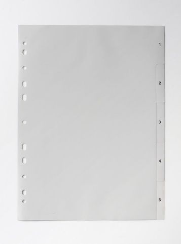 Rozdružovač, rozlišovač nebo rejstřík. Praktická pomůcka pro oddělování dokumentů, rejstřík 1-5, formát A4, šedá barva. Vhodné k zavěšení do pořadače. Polypropylen, síla 120my