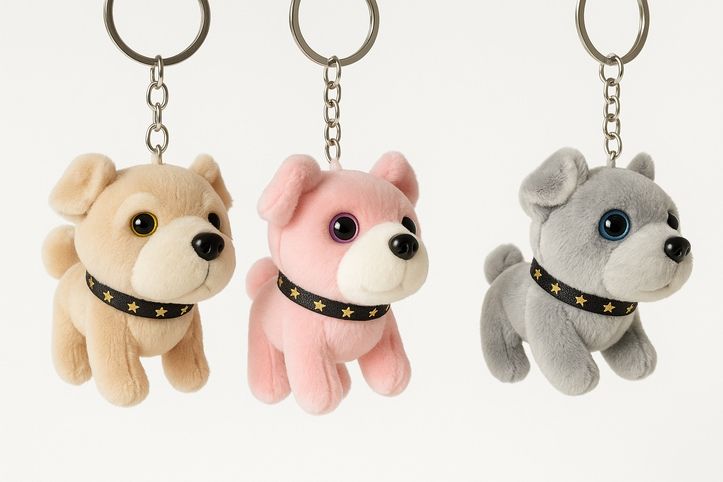 Dodejte svému batohu, kabelce nebo klíčům kouzelný nádech s tímto měkoučkým plyšovým přívěskem ve tvaru pejska! K dispozici ve třech krásných barvách – béžová, růžová a šedá – každý pejsek má plastový čumáček, výstižné oči a stylový černý obojek se zlatými hvězdičkami.