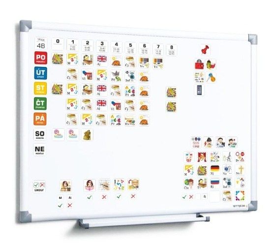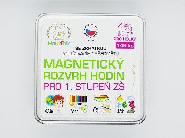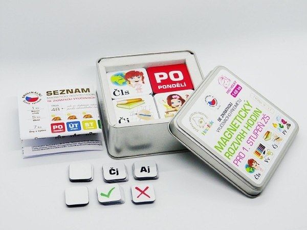 V plechové krabičce najdete 146 magnetek ze kterých si každá školačka poskládá svůj rozvrh hodin.