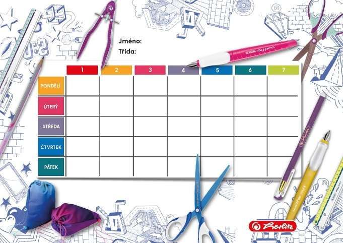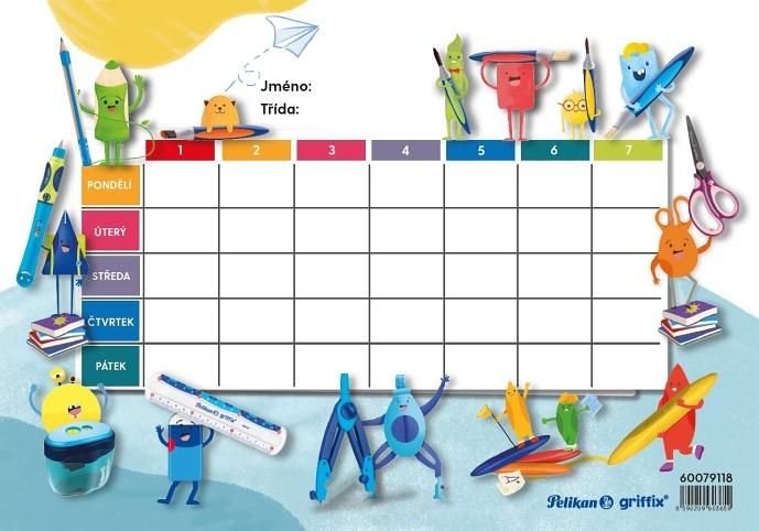 Dny od pondělí do pátku, až 7 vyučovacích hodin, motiv Pelikan griffix a školní potřeby herlitz, papír 200 g/m2